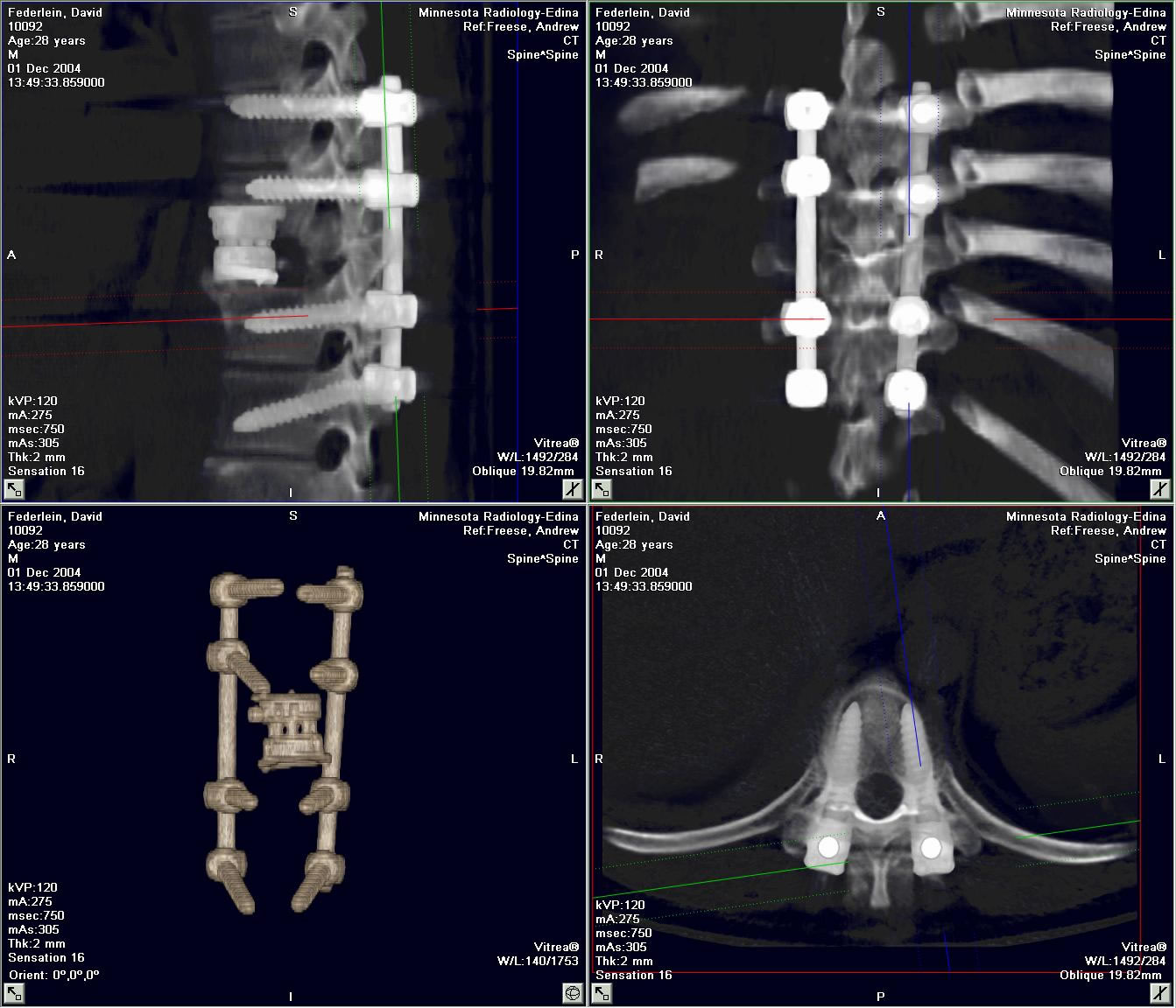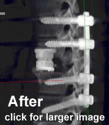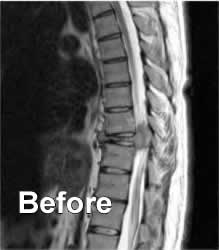 Firstly, I want to address the clique of “alternative therapists” that advocate magnet therapy. The average power of a kitchen magnet’s magnetic field, if of high quality, is roughly 1000 gauss (.1 tesla.) These magnets sold as bracelets, rings, or pendants are said to cure chronic pain of muscles and bones. The average MRI (Magnetic Resonance Imaging) scan has a magnetic field power of 30,000 gauss (3 tesla.) Here is the MRI scan of my spine before the surgery: