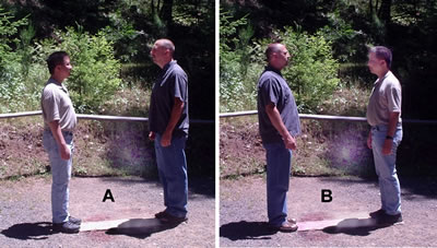 In the “A” photo, the chap on the right appears to be significantly taller than the other man; he’s looking right over the top of his head. However – miracle! – in the “B” photo, where the two have simply switched relative positions, the shorter man appears to have grown – by several inches! This seeming anomaly is attributed – by the woo-woos – to the fact that the photos were taken at the location of the mysterious Vortex, and those who fall for the stunt just can’t figure out how a person can grow (or does the other guy shrink?) simply because of switching positions by about five feet, horizontally. But they of course accept it as a miracle, rather than a simple optical illusion – which it is.