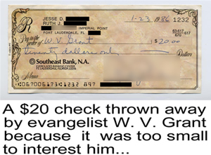 I was re-organizing boxes of documents recently, and came upon one packed with mementos of the Grant investigation. Our search of the trash left behind when Grant departed a “crusade” at the Fort Lauderdale Armory Auditorium had yielded a mass of valuable material. We found notes from his wife – “Hurry up. We have 10:30 reservations at the restaurant” – as well as yellow Post-it notes discarded from his huge Bible after use – “Bill, arthritis in knees, veteran, 101 Tate Street, daughter Sally” – and a paper bag containing some $600 in discarded checks.