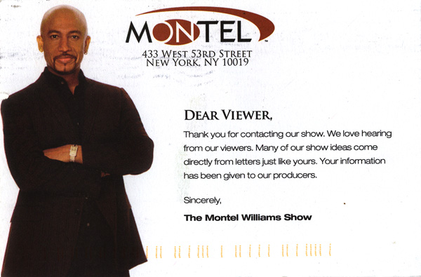 MONTEL′S CYNICISMNow, it′s obvious that Montel Williams has no way of keeping track of the thousands of pieces of mail he receives, and he′s not responsible for this affront to Hal Bidlack, in non-response to Hal′s earnest letter, which can be seen at tinyurl.com/22vo6b. Here is the postcard, a form answer that says nothing…